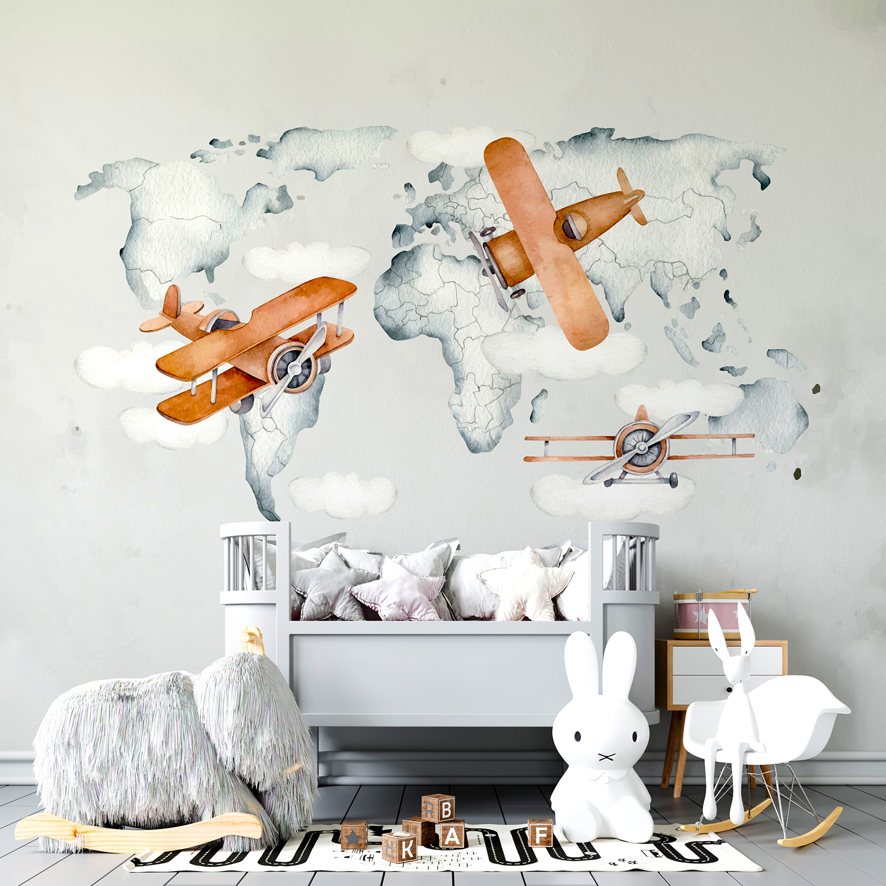 O nosso Painel de Parede Personalizado Mapa Mundi e Aviões é um adesivo autocolante, não necessitando de cola como os papéis de paredes convencionais.