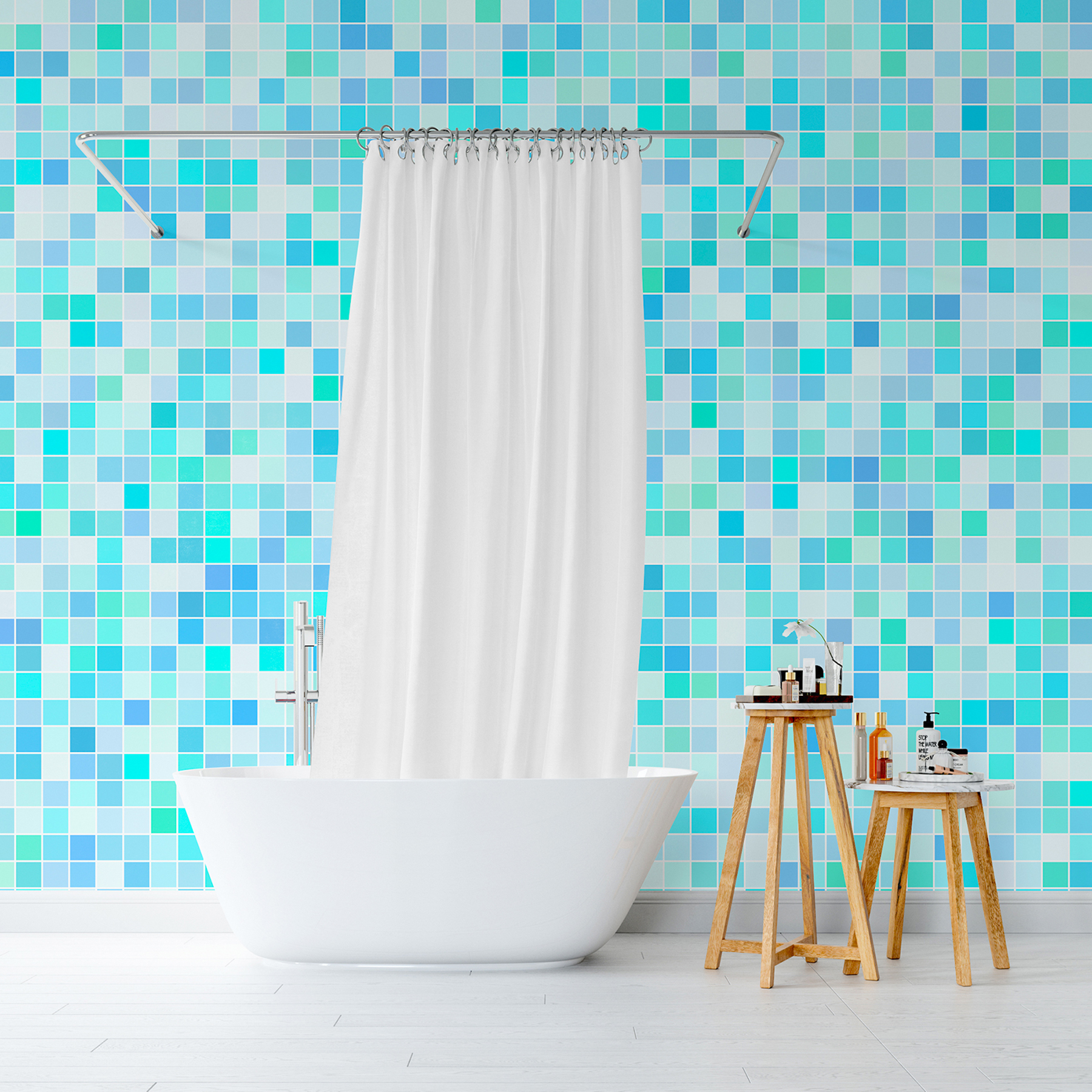 O nosso Papel de Parede Pastilhas em Tons de Azul é um adesivo autocolante, não necessitando de cola como os papéis de paredes convencionais.