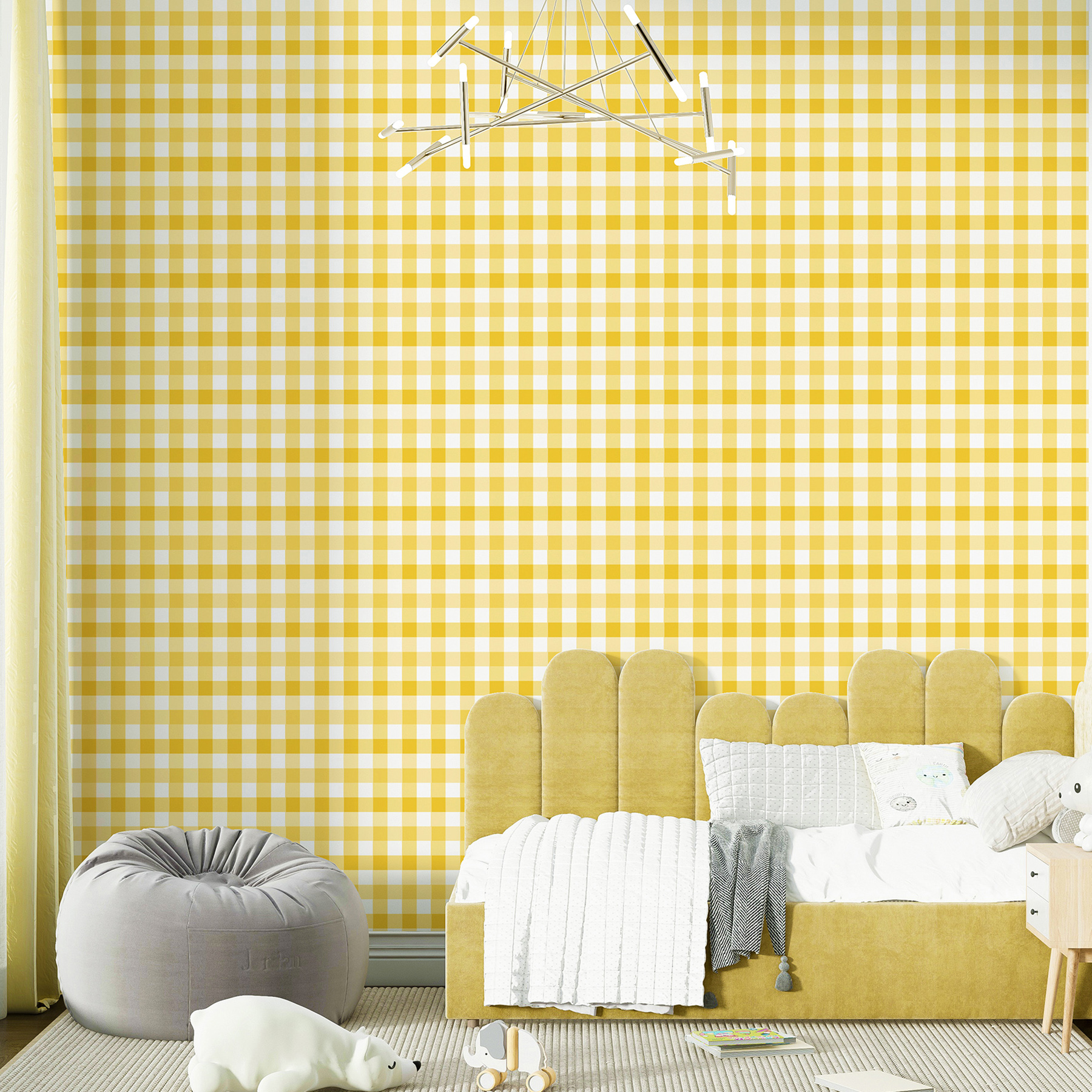 O nosso Papel de Parede Vichy Amarelo é um adesivo autocolante, não necessitando de cola como os papéis de paredes convencionais.